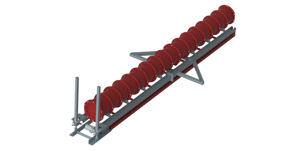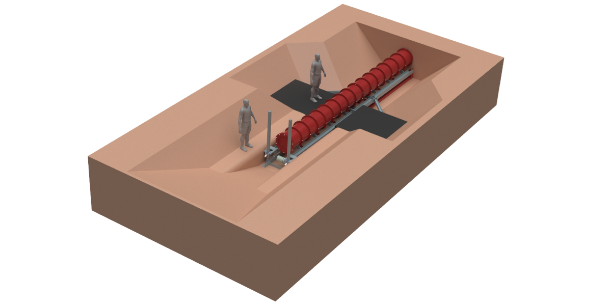 Building upon the success of the first version of the starting platform, for our second iteration, we added the ability to change the angle of the starting platform to enable different launch positions. This allows us to launch directly from the surface without digging a starting pit first and thus saving valuable time. If desired however, it is still possible to start from such a starting pit by for example angling the platform horizontally. The starting platform initially takes all the propulsion forces up until the gripper plates of the propulsion system are fully inside the tunnel and guide the machine into the ground along the tunnel lining.