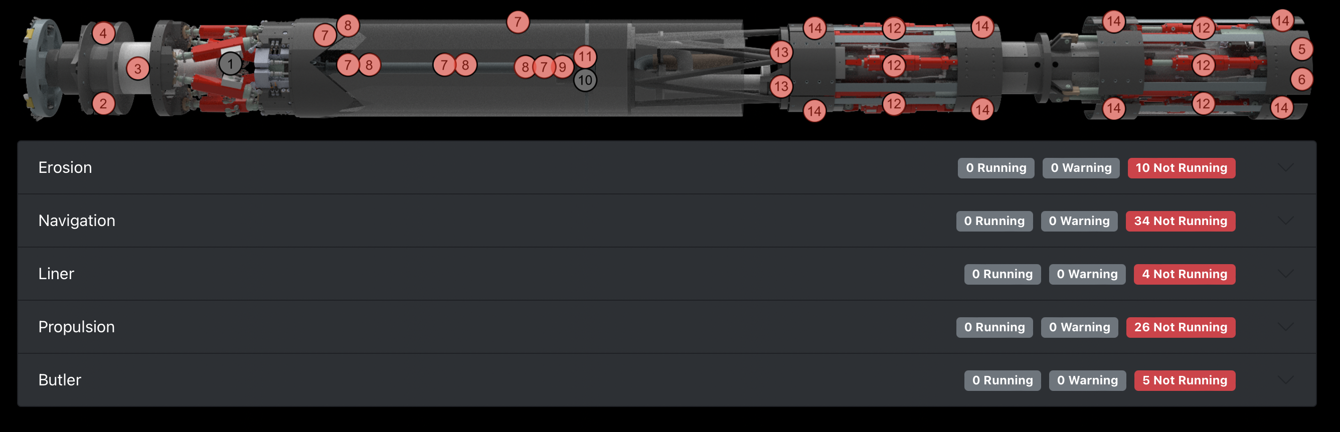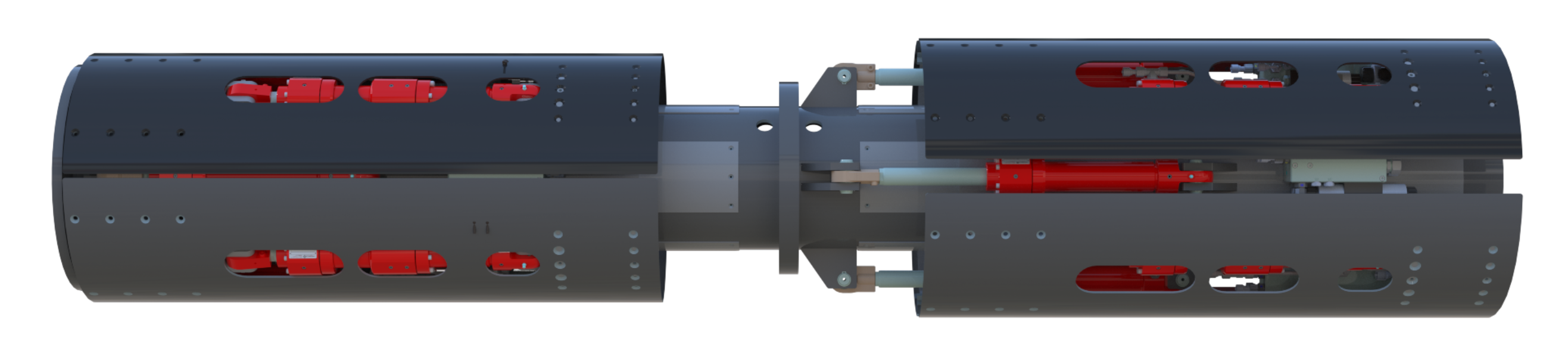 The second part of the navigation system is the propulsion mechanism. The coordinated action of sixteen high-performance hydraulic cylinders and eight gripper plates pressing against the tunnel wall allows for continuous machine movement with 200kN of force.