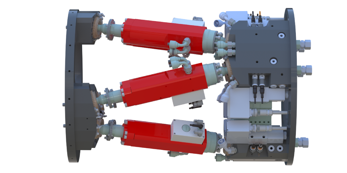 The navigation system is composed of two parts. The first is the steering mechanism, an innovative custom-made hydraulic hexapod system allowing us to dig curved tunnels. Using six hydraulic high-precision cylinders, it allows us to move in six degrees of freedom. Furthermore, utilizing custom software, it is possible to use this setup as a jackhammer, allowing for strong vibrations of frequencies as high as 20Hz. Besides that, thanks to the eighty-five sensors the navigation system houses in total, we can guide the machine autonomously with the accuracy of a few millimeters.